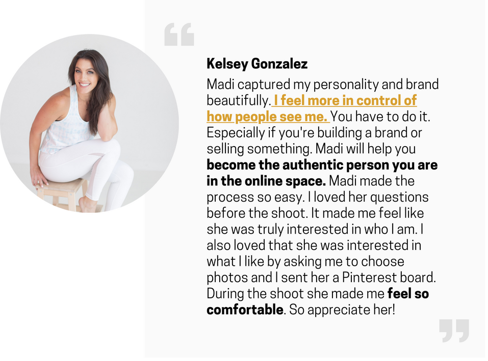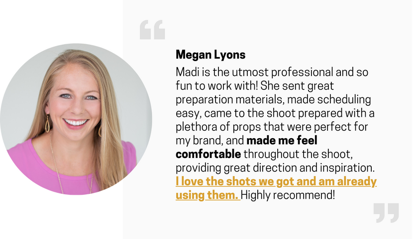 Madi will coach you at every step of your photoshoot so you get the pictures your brand needs!She’s a master at helping you communicate what makes you unique and powerful into pictures.She will help walk you through the “how to” of turning your ideas of what you want to say to people into pictures you will be proud to post anywhere.