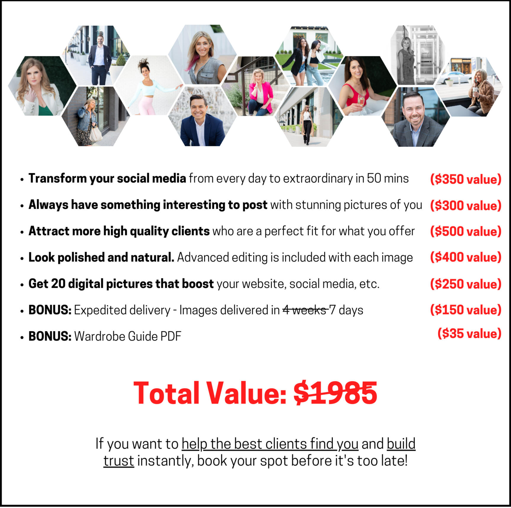 Yet you get everything we talked about above when you save your spot in the next photoshoot today!